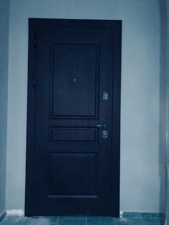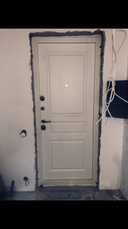 Обратитесь на производство, где делали дверь. Они вам сделают окантовку (крюк) в цвет внутреннего мдф и наличники. У нас вот так