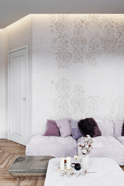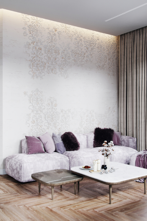 Ирина, доброго дня. За диваном художественная роспись в обьемной технике "трафарет"