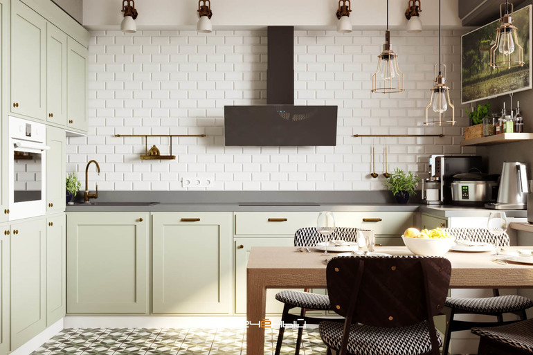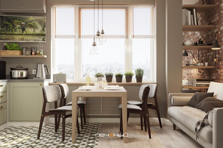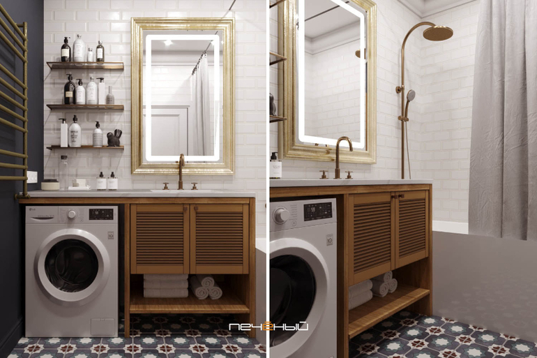 Решили не делать в кухне верхних шкафов - этот приём отлично подходит для кухонь-гостиных. Благодаря ему мебель не смотрится слишком тяжелой, появляется больше воздуха и света, а само помещение перестаёт выглядеть слишком "кухонным". Плитка-кабанчик в сочетании с теплыми металлами - бронзой, медью, латунью - сильно добавляют ретро-настроения. А ведь это именно то, чего хотели хозяева квартиры.