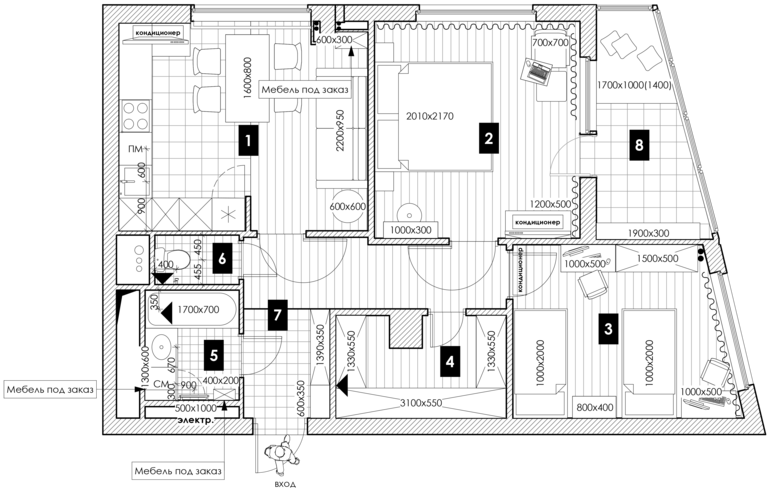 Общая площадь квартиры 71 кв. м. В ходе перепланировки мы немного расширили кухню-гостиную (1), чуть сдвинув стену в сторону. Перенесли дверной проём в спальне (2) вправо и чуть уменьшили потенциальную детскую (3), чтобы сделать просторную гардеробную (4) в коридоре и избежать необходимости ставить шкафы в жилых комнатах. Детскую не визуализировали, потому что детей у заказчиков пока нет.