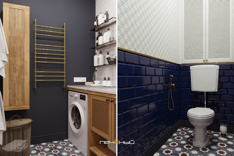 Чтобы получить ретро-эффект, использовали плитку "кабанчик" и выбрали унитаз с отдельно стоящим бачком. Жалюзийные дверцы, жёлтый металл, монохромные баночки для косметики - вот ещё несколько секретов для оформления ретро-санузла.