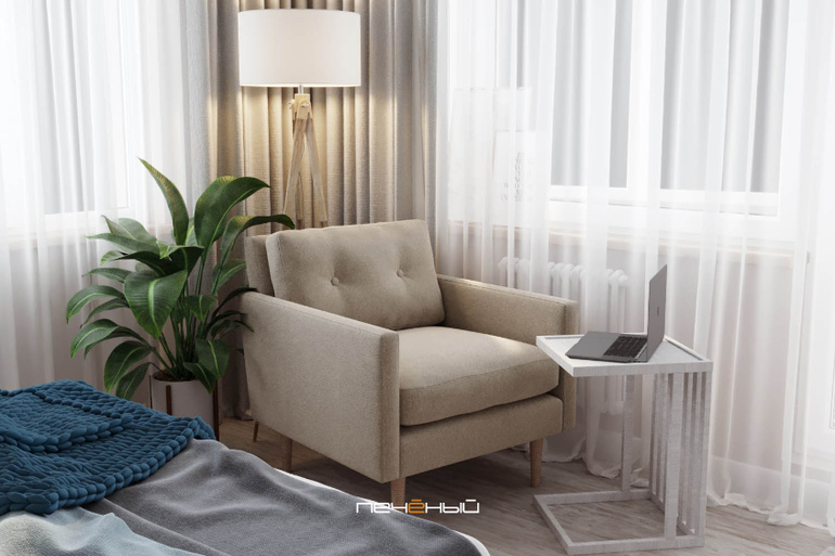 Это угловая комната с двумя окнами, причём здесь и обычное окно, и балконное, с дверью. Застеклённая утеплённая лоджия может стать полноценным рабочим уголком, если один из супругов спит. На плане ниже видно, что она достаточно вместительна, с удобным диванчиком и стеллажом для хранения мелочей.