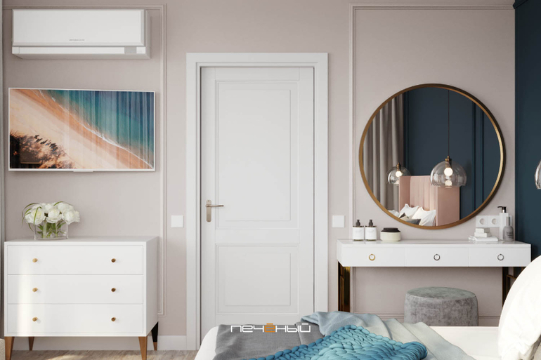 Советую обратить внимание на молдинги. Их очень прикольно располагать не симметрично, а как-то непредсказуемо, как в нашем случае: одну из образовавшихся рамок мы перенесли на соседнюю стенку через внутренний угол на стыке стен, светлой и тёмной.