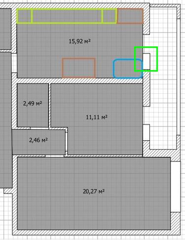Зелёным обозначен кухонный гарнитур, за ним по этой же стене будет рабочее место с компьютером. Напротив него, в углу - диванчик. Рядом обеденный стол.