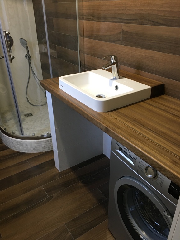 Вопросы и ответыВсем привет. Прошу помощи знающих и опытных. Предстоит ремонт в ванной, сейчас в поиске мебели и способа организовать пространство. Стены хочу выложить белой плиткой и 1 акцентную стену плиткой под дерево. Также хочу сделать тумбу и стиралку под одну столешницу. Свободное место шириной 120 см. Очень нравятся решения, где белая тумба и деревянная столешница. Смотрела варианты изготовления на заказ и ценник там ого-го, а бюджет у нас весьма скромный. Но столешницу хочется 😊 У меня появилась идея купить отдельно тумбу и отдельно деревянную доску , которую покрыть маслом с воском. Кто так делал или знает как это можно сделать? и можно ли вообще? Столешница будет примыкать одним краем к ванной. Место, конечно, повышенной влажности. Подойдет ли простой мебельный щит? В общем жду советов стоит ли заморачиваться.