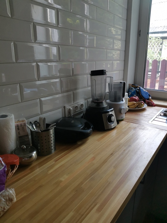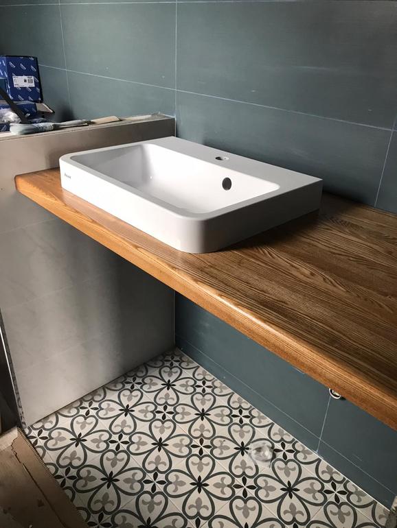 Масло Osmo с воском для столешницы в ванной не очень подошло... либо мастер не очень хорошо пропитал. От воды поднимается ворс на дереве и почему-то если более интенсивно протираешь, остаются более светлые пятна. Будем переделывать.