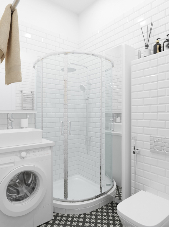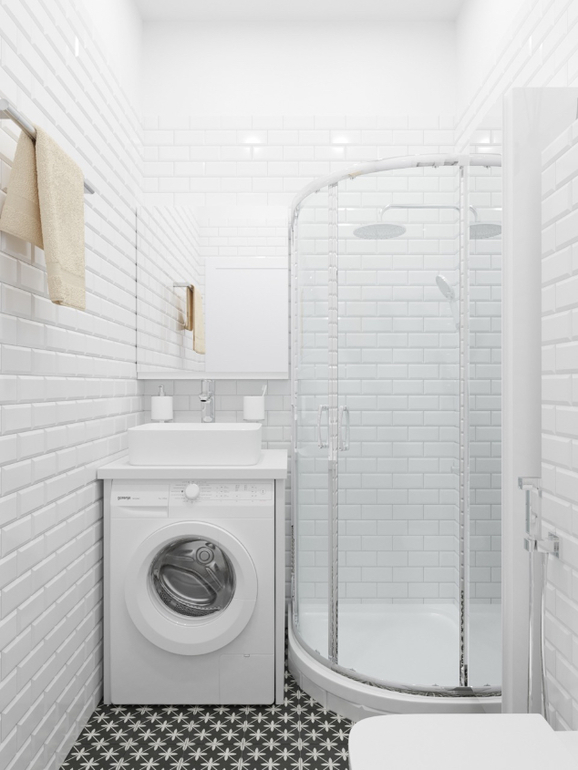 Мне очень напольная плитка понравилась. Смущает стиральная машина - зазоров нет на вибрацию и достаточно ли 50 см для всех коммуникаций? Если помните, что за модель раковины? Не видела таких для стиралок.