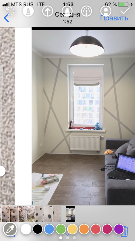 кровать-трансформер на этом фото откинута вверх, поэтому видим диван. Эта стена акцентная, на ней вот такая геометрия: