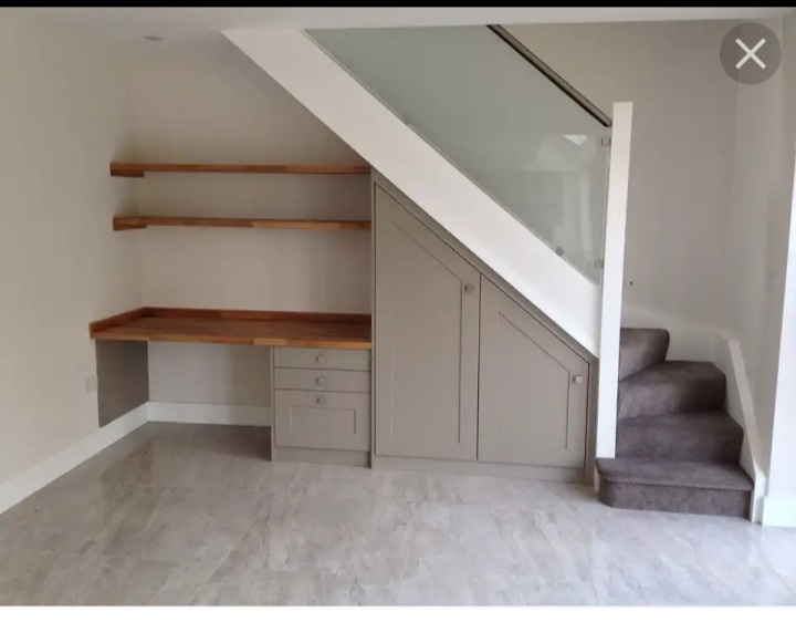 Даже не видя вторую фотку, сразу подумалось, что в первую очередь перекрасила бы саму лестницу)) и.е. я бы и шкаф, и лестницу перекрасила в бежевый - в цвет мебели под лестницей.