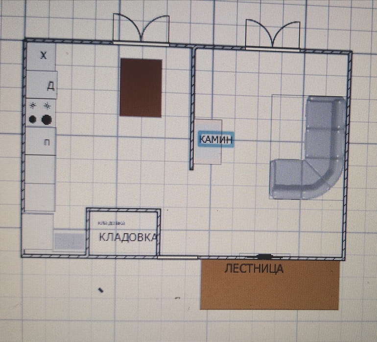 У вас камин настоящий? Я бы заменила кладовку на пеналы или другое расположение кладовки. Кухню нужно проектировать с учетом треугольника холодильник-мойка-плита, если идеально. Коричневый - это стол? Очень мало места для стульев у стены. Может не стоит разделять кухню и гостиную? Оставить единым пространством.