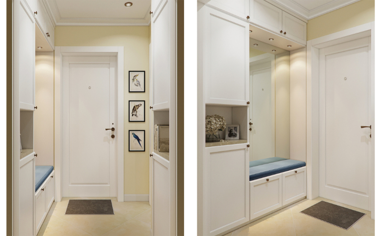 В прихожей выделить зону для хранения обуви и одежды, пуф, сохранить