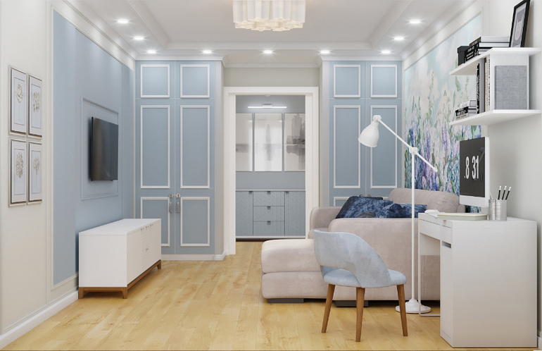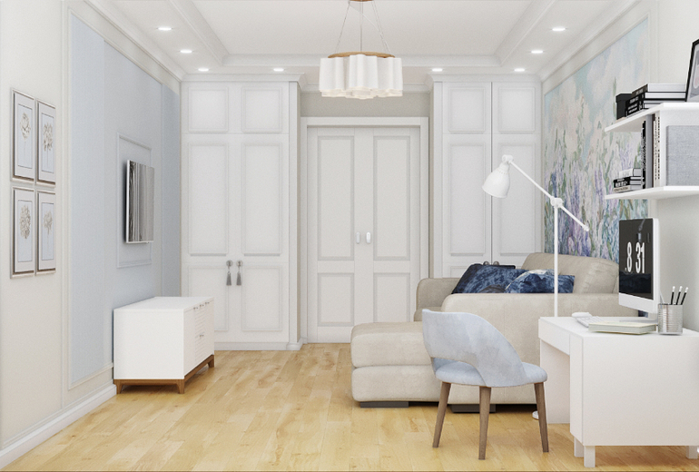 В гостиной создать шкафы для хранения вещей, зону отдыха со спальным место, рабочую зону для ПК и место для мольберта.