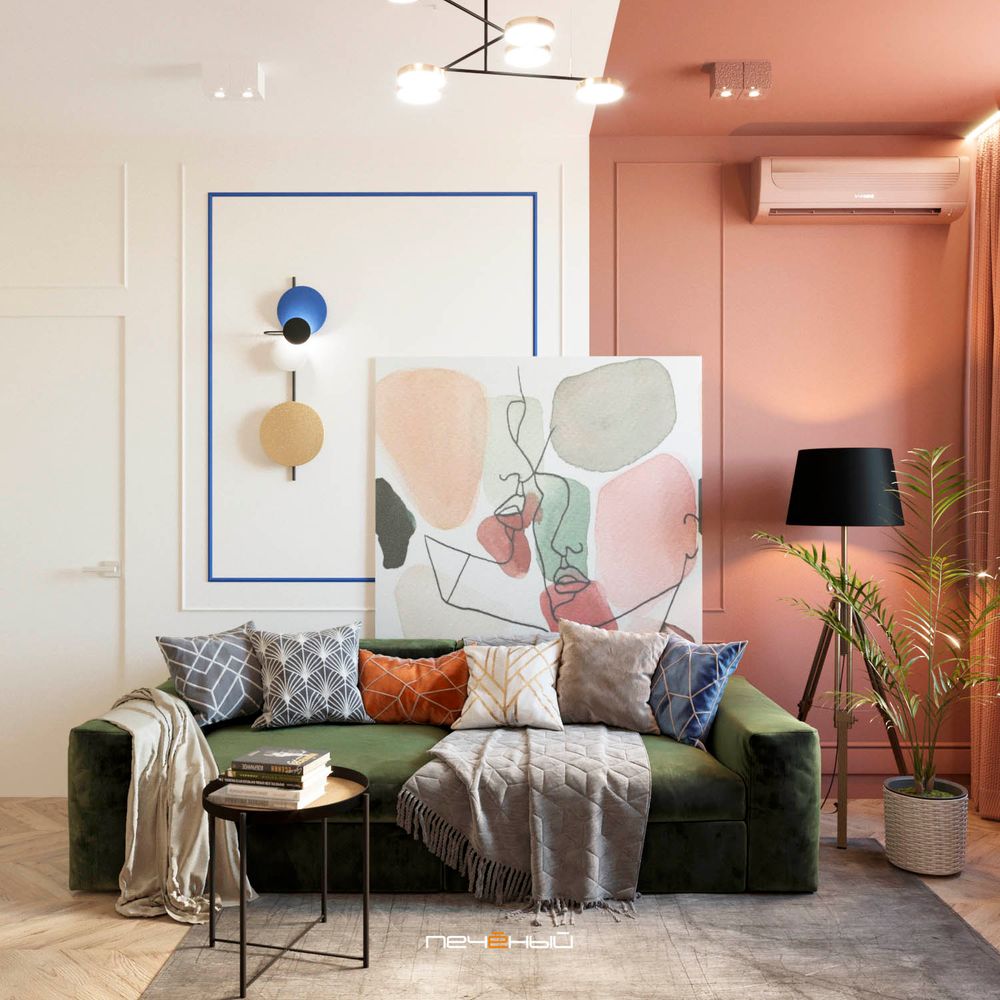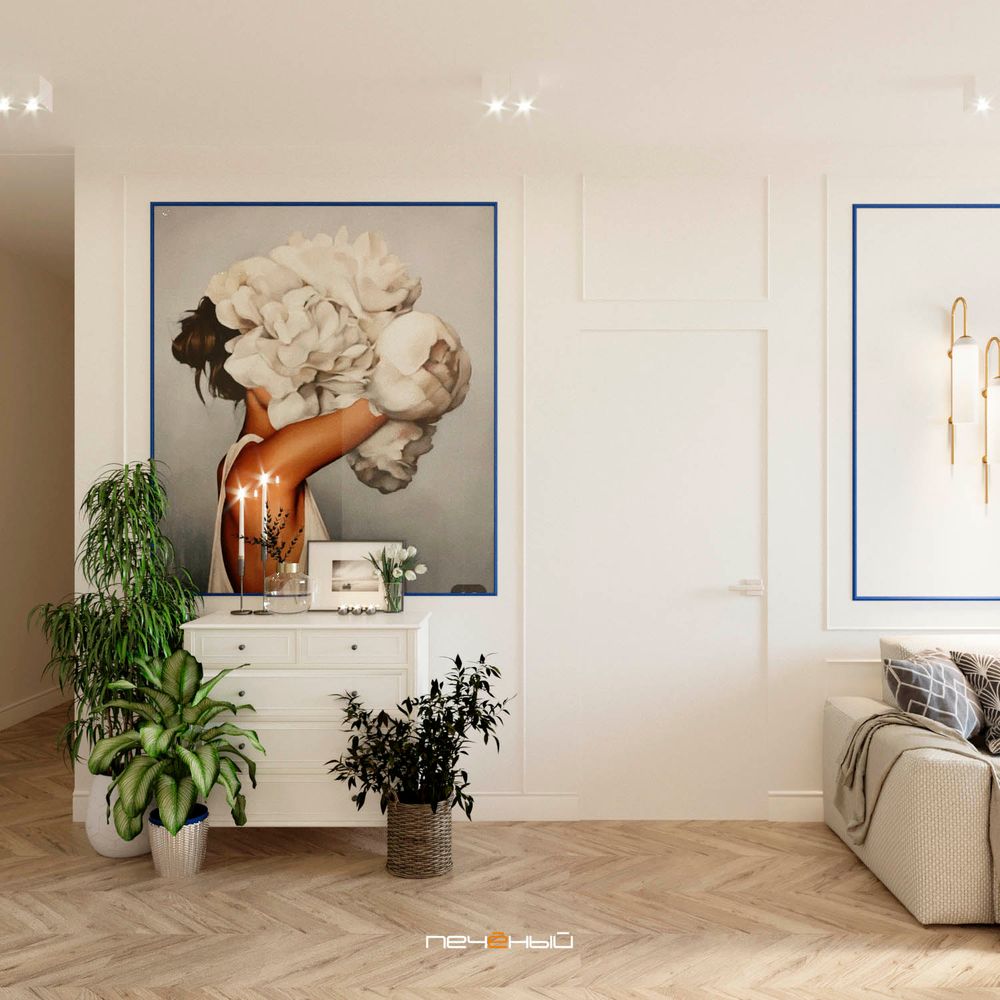 С гостиной было больше всего возни. Чтобы решиться на такой интерьер, нужен определённый склад характера. Что для одного «вау», то для другого перебор!)) Здесь есть три крутые идеи, которые точно стоит взять на вооружение: синий цвет молдингов - раз, использование молдинга в качестве цветной рамы и эффект «сползшей картины» - два, цветная часть стены и потолка - три. При этом внимательный читатель заметит некоторые расхождения на картинках одной и той же гостиной. Это - отголоски согласований: в ходе обсуждений визуалок мы меняли изображения на постерах, дизайн потолочных и настенных светильников, а также цвет стены и модель дивана.