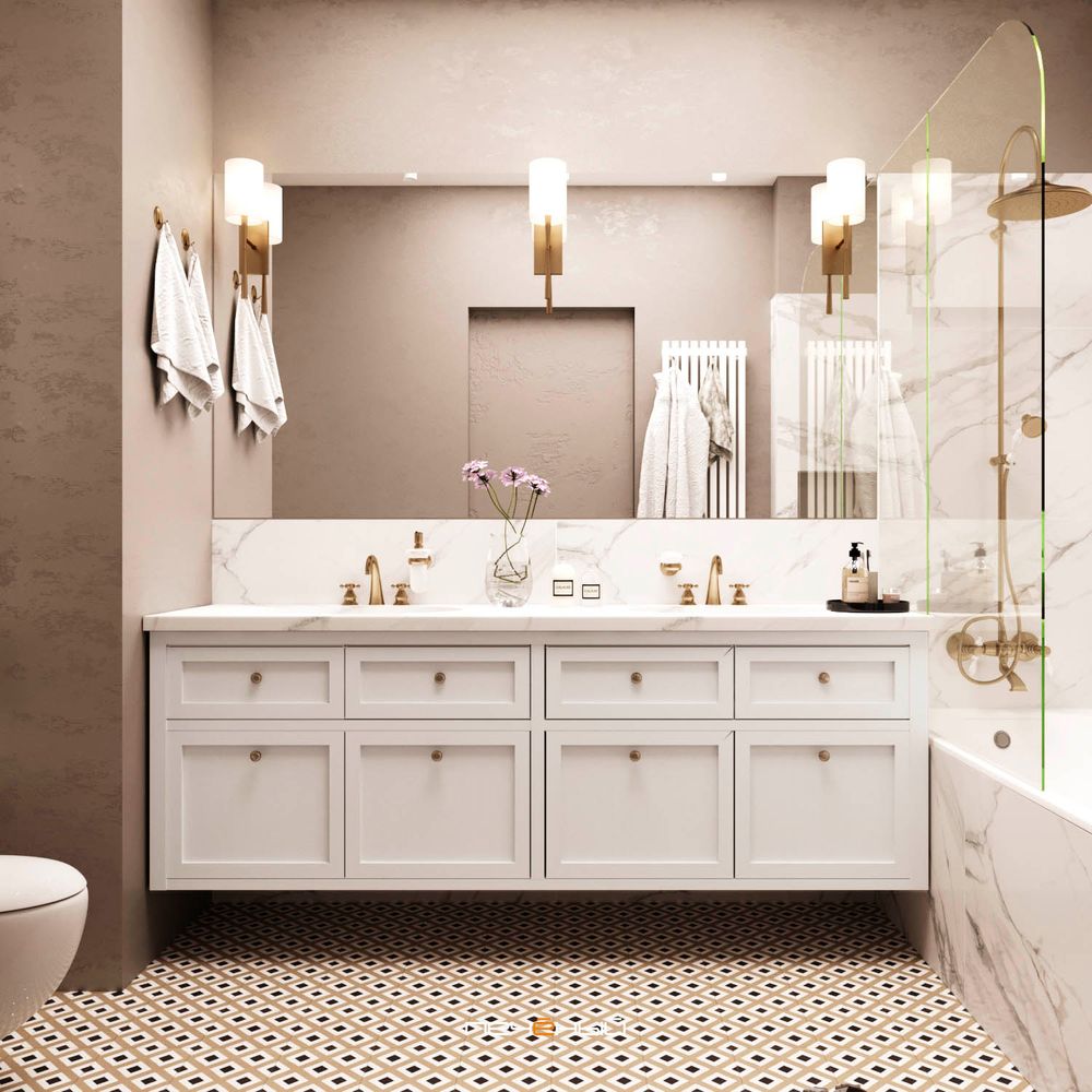 Две раковины - это удобно! Особенно, когда родители и дети одновременно встают и собираются на работу и учёбу. Большой санузел находится возле детской и спальни, поэтому вполне логично, что умываться и чистить зубы здесь будет вся семья. К тому же, заказчица привыкла наносить макияж в ванной комнате, и туалетного столика в спальне не делала. Так что условно можно поделить раковины на «мамину» и «мужскую». :)