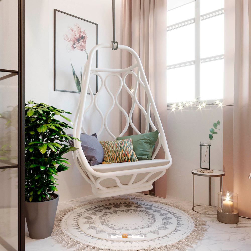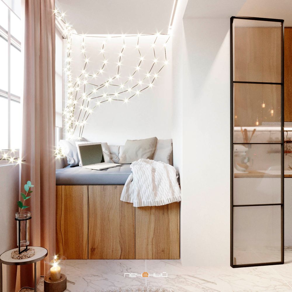 К слову, балкон получился бомбезным! Ничего общего с лоджиями, на которых хранится всё, что не поместилось в шкафах. Чтобы визуально сделать кухню и лоджию единым пространством, мы использовали одно напольное покрытие и прозрачные двери: такие и смотрятся воздушно и, что важно, не препятствуют проникновению дневного света. Разумеется, при таком раскладе нельзя было допустить балконного «хламовника»! Поэтому - очень уютная зона с подвесным креслом и диванчик с подушками, в основании которого организованы дополнительные места для хранения.