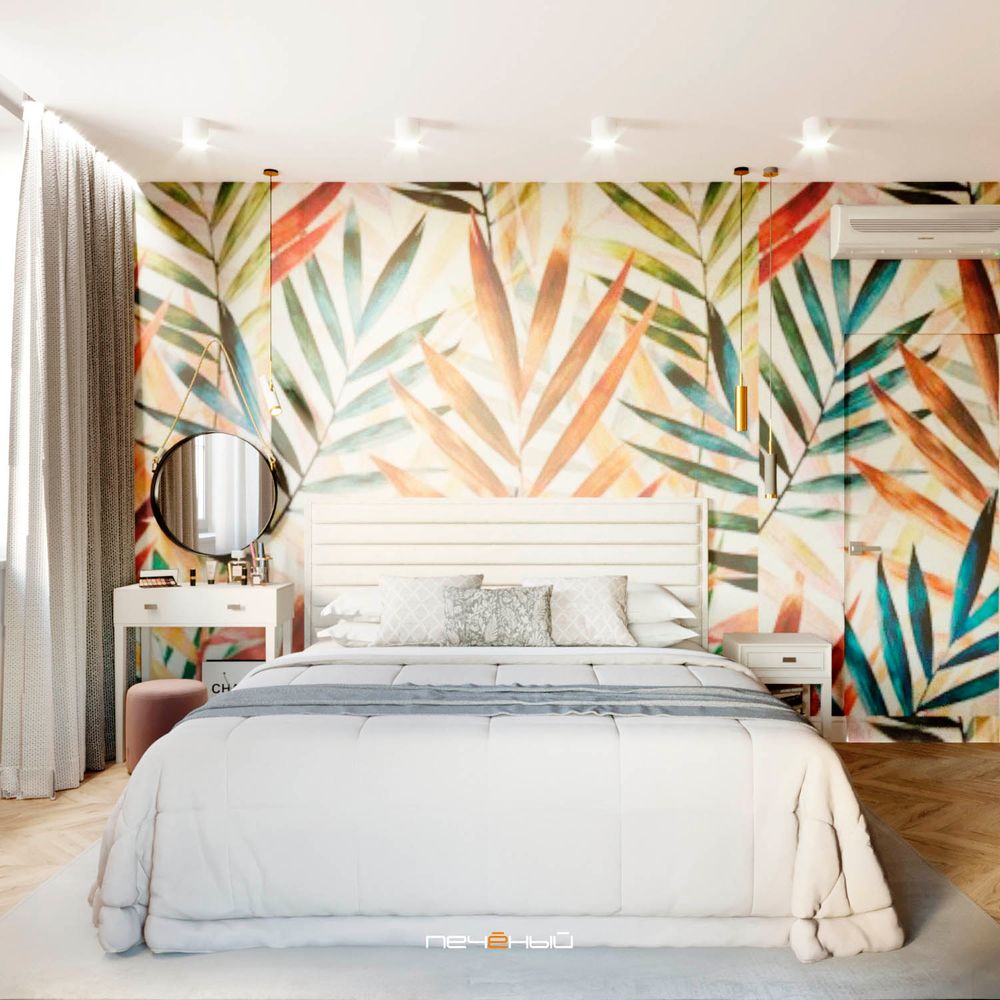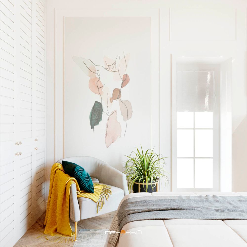 В спальне два окна, и это большое везение. Узкая дверь возле кресла ведёт на отдельный балкон. В процессе перепланировки вход в спальню переместился; освободившуюся стену занял вместительный шкаф. Классный приём - оформить его фасады так, чтобы они перекликались с изголовьем кровати.