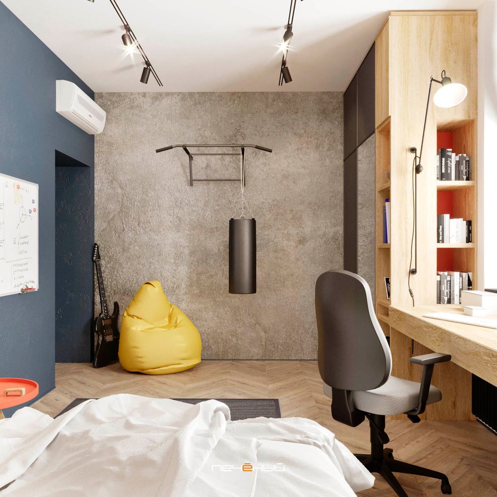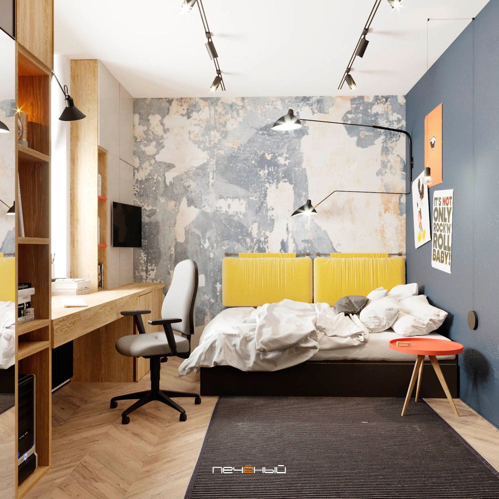 Недетская детская: штукатурка под бетон, синяя краска и качественные фотообои - настоящее комбо! :) При этом всём мебель из светлого дерева добавляет уюта и немного разбавляет этот брутальный современный стиль в интерьере.