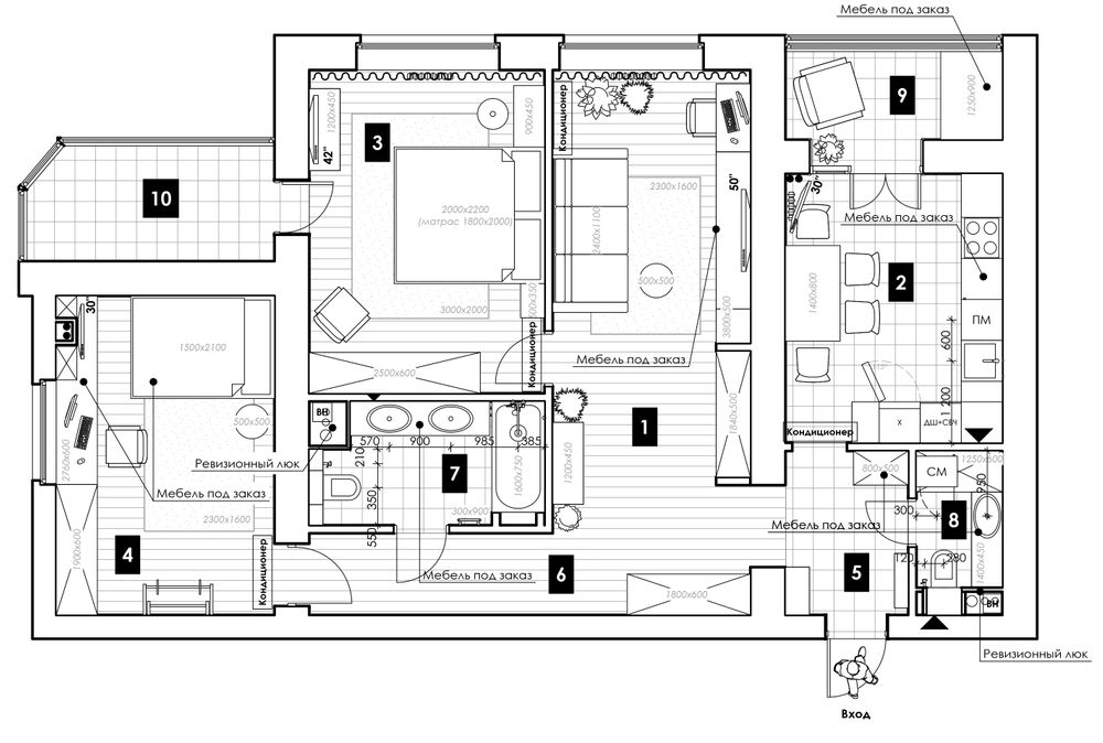 Общая площадь квартиры - 102 кв. м, оформление в современном стиле. В гостиной демонтировали часть стены с дверью, сделав её одним общим пространством с коридором - это добавило простора и воздуха. Вход в спальню сделали из гостиной. Дверной проём в кухне сместили ближе к стене, чтобы гармонично разместить кухонную мебель и столбик с бытовой техникой.