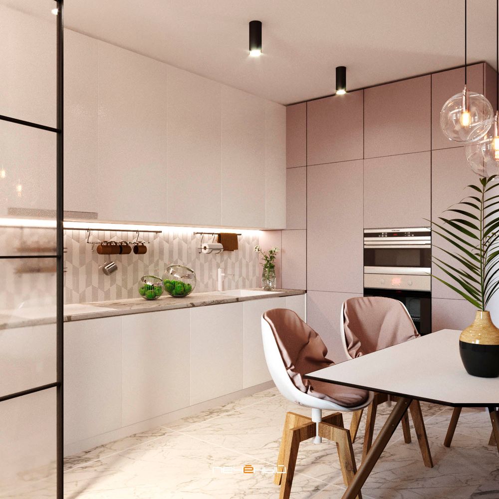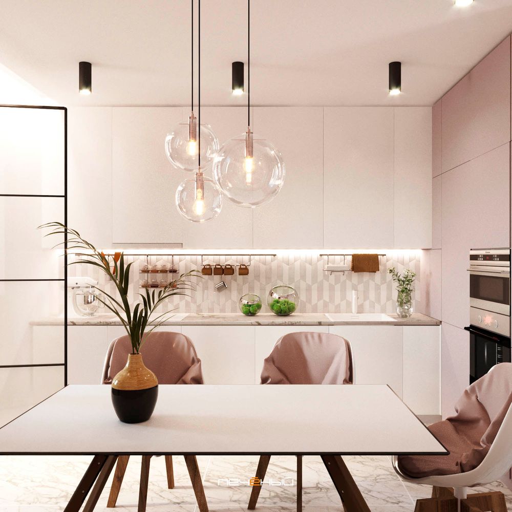 Кухня не зря кажется очень девичьей: хозяйка лучше знает, как ей организовать пространство! :) Мужу пришлось уступить. Однако взгляните, помещение не выглядит кукольно-приторным! Всё дело в правильно подобранном оттенке и белых фасадах, которые уравновешивают визуальный ряд. Плюс суперстильные тонкие чёрные линии добавляют шарма: рама картины, кайма стола, потолочные светильники и прозрачные балконные двери.