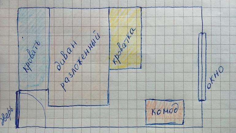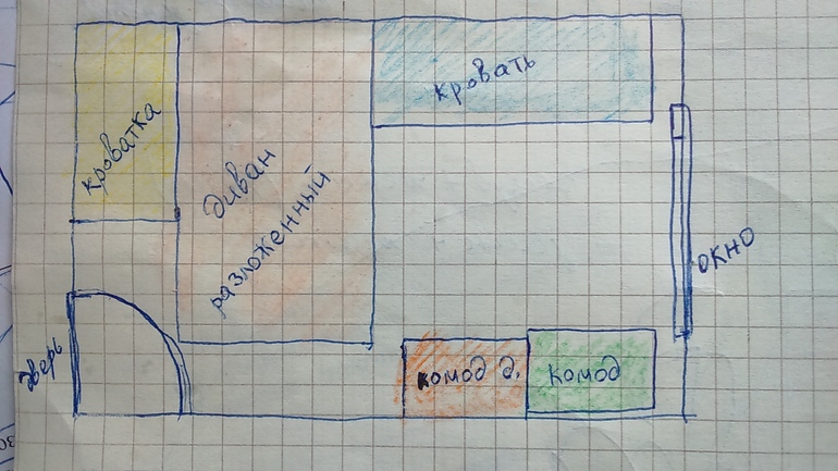 Интерьерное решение спальниНиже схема расстановки, как сейчас. Всё устраивает, но надо добавить шкаф для детских вещей и постельного. Шкаф еще не куплен, не могу даже представить размер и конфигурацию.