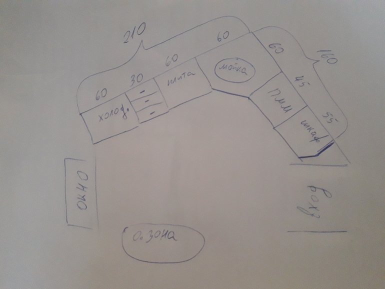 Планируем все делать по стенам, где холодильник и стиральная машина, кухня будет буквой Г. Стены 210×160 соответственно.