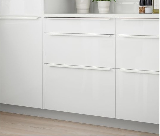 Пока что решили дверки без ручек, а ящики с ручками. Вопрос, какие ручки ставить. Остановились на белых Бильсбру. Они бывают разной длины: 4, 12, 32, 52,72 см.