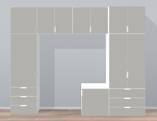 Между шкафом и тумбой будет стол (парта Нанотек, она уже есть). Сами фасады будут белые, на картинке сделала серым для наглядности.