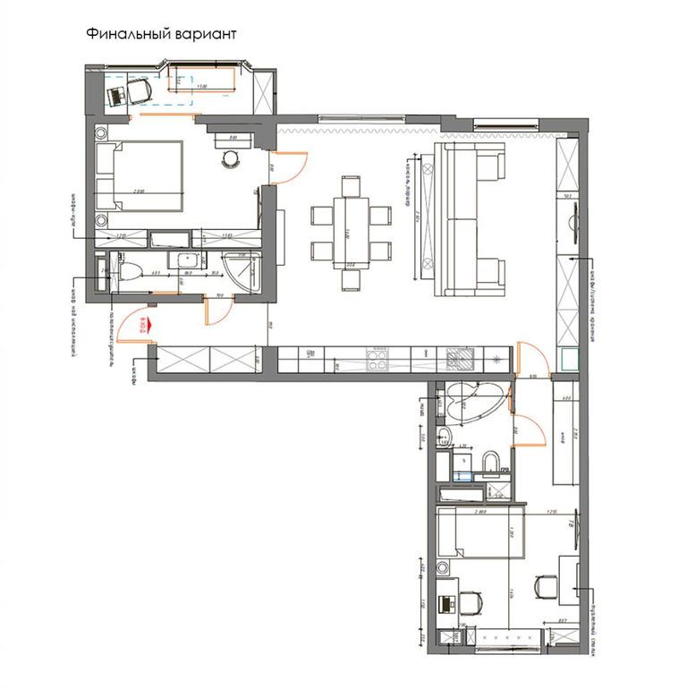 🔸Кухню перенесли в зону коридора. На месте прежней кухни организовали небольшую спальню с выходом на балкон. (при согласовании отметили как "кабинет").