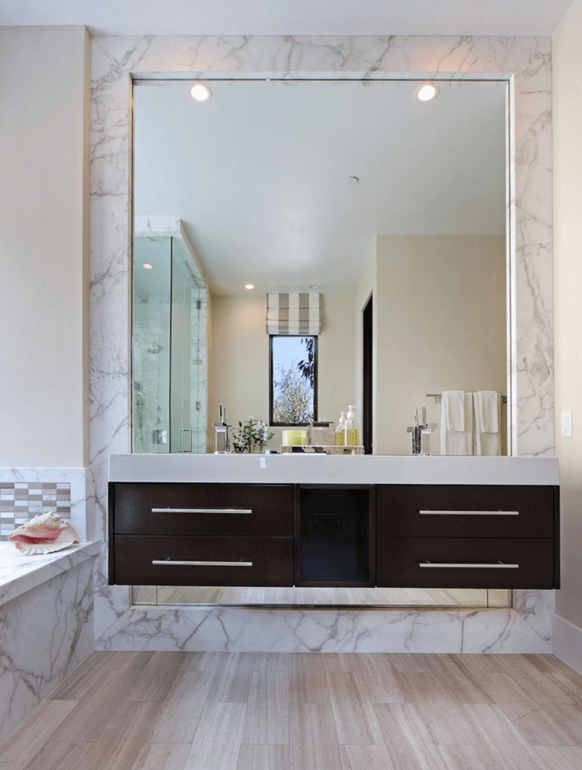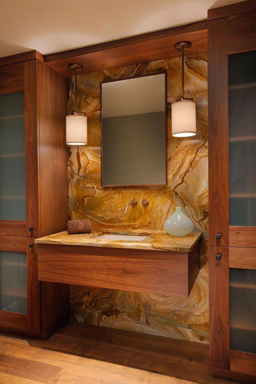 Оля, в интернете очень много картинок таких интерьеров, в основном бело-серый мрамор с деревом хорошо сочетаются.