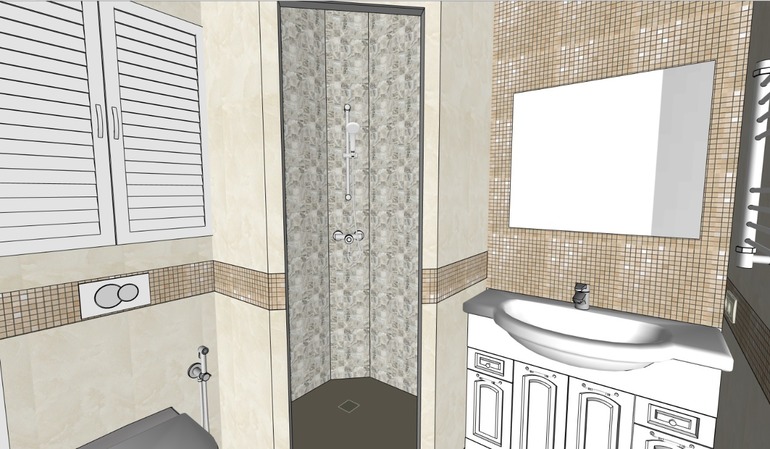 Оля, согласна с вашим мужем насчет мозаики в душевую - это будет смотреться хорошо точно. На визуалке у вас сейчас, извините, но что-то аляпистое в душевой. Стену с зеркалом можно выделить более темным цветом