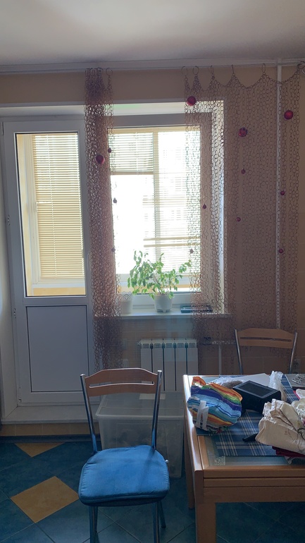 У вас планировка как у нас! Мы повесили однотонные плотные шторы и собирали их сбоку. Как раз трубу закроют. У нас все было в бежевых цветах, думаю и вам какие-то в цвет столешницы и стен, синий кажется будет уменьшать пространство и выглядеть тяжеловато.