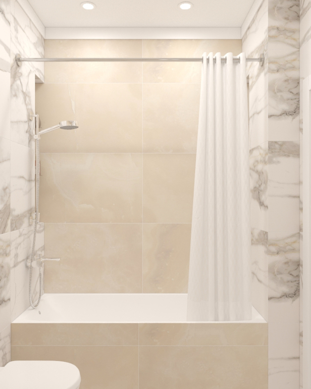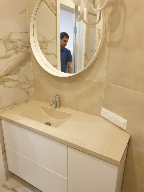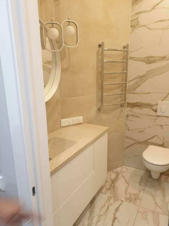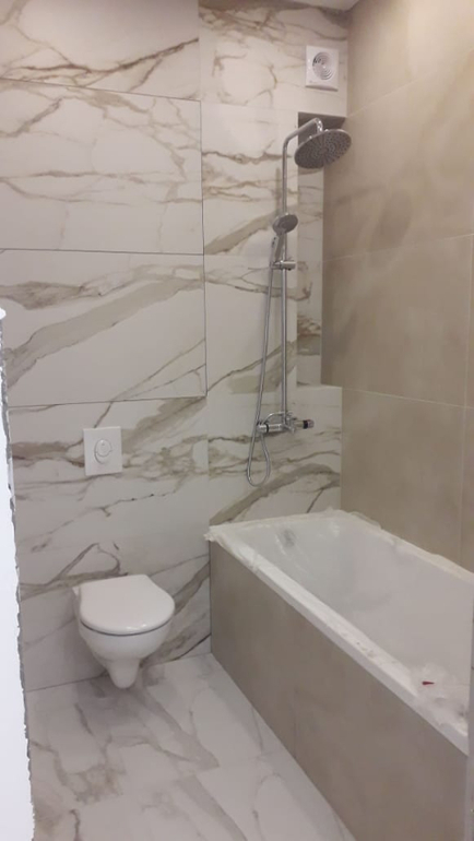 Небольшой недосмотр за строителями, которые зачастую не парятся по укладке плитки. Часто встречающаяся проблема у них, особенно с рисунком, имитирующий мрамор calacatta - две плитки подряд с одним рапортом + без какого либо разворота рисунка. Ну, не художники они))) поэтому, с мрамором, который идёт не цельным куском, стоим над душой))