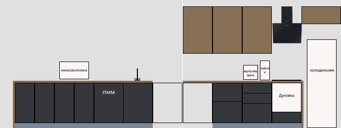 Сбоку стенку сделайте как корпус шкафов, чтобы холодильник не пачкался и грязь в щель не летела. И шкаф над холодильником странный, обрубочек получается... У Вас такой размер кухни, что есть, куда двигать духовку. Покрутите еще расстановку. МОжет, вытяжку на полновстраиваемую для симметрии заменить...