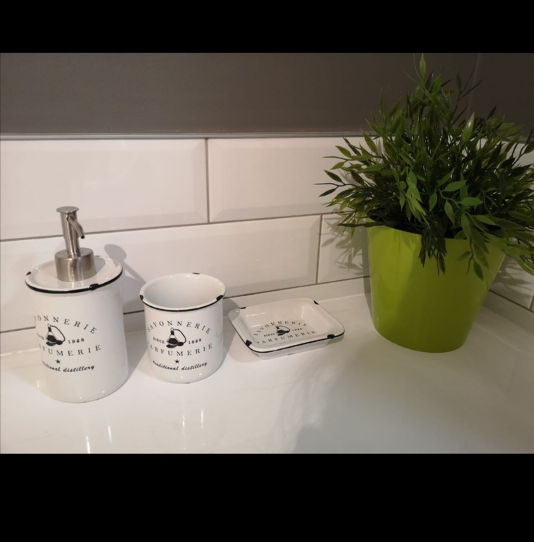 Коврик и полотенце для рук в цвет горшка. Штора белая со смешной пандой. У нас, правда, особо "разгуляться" негде.