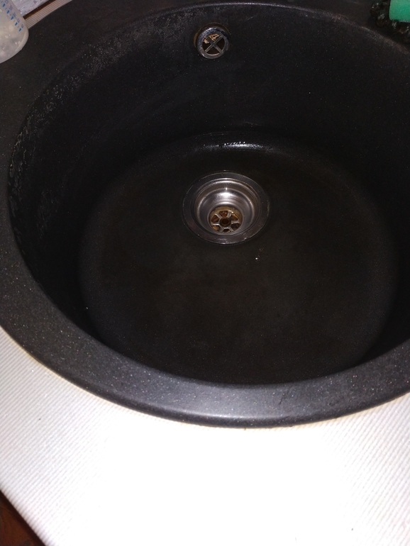 Я тоже лью кипяток или в отверстие строго, если немного, или открываю воду холодную, когда, например, картошку сливаю. Хорошая раковина, и на черной не так видно грязи, как на светлой, если вода не сильно известковая, конечно.