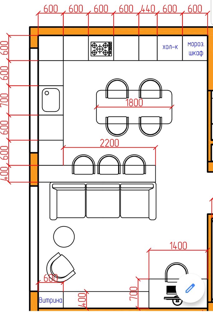 Вопросы и ответыВот нарисовалась наша объединенная кухня-гостиная-рабочий кабинет в трёшке . Думаю еще, в принципе, над планировкой . Пока так: