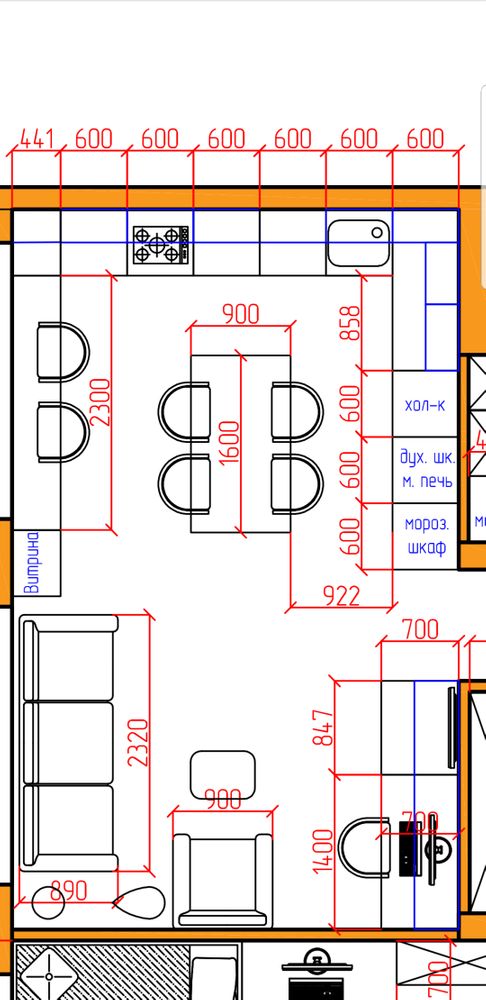 Между кухней и гостиной ни каких преград в виде дивана и так далее.. помещение маленькое, мебели много, и кухня тут, и гостиная с тв, и мое полноценное рабочее место... И всего 28 кв.м...