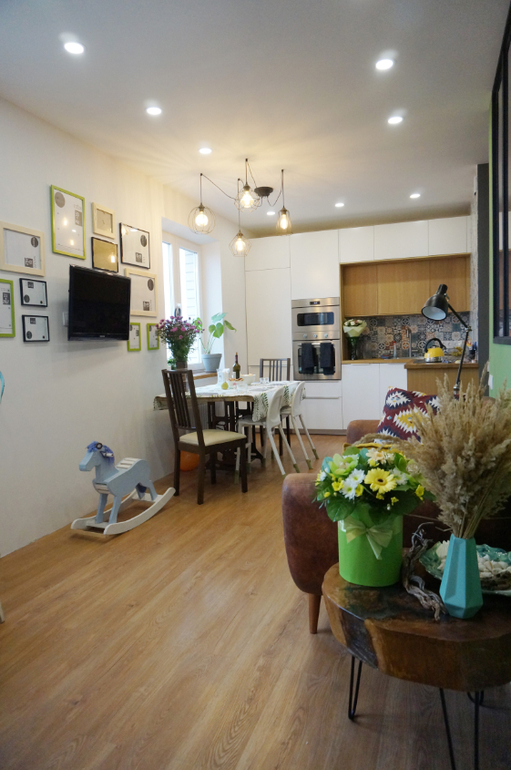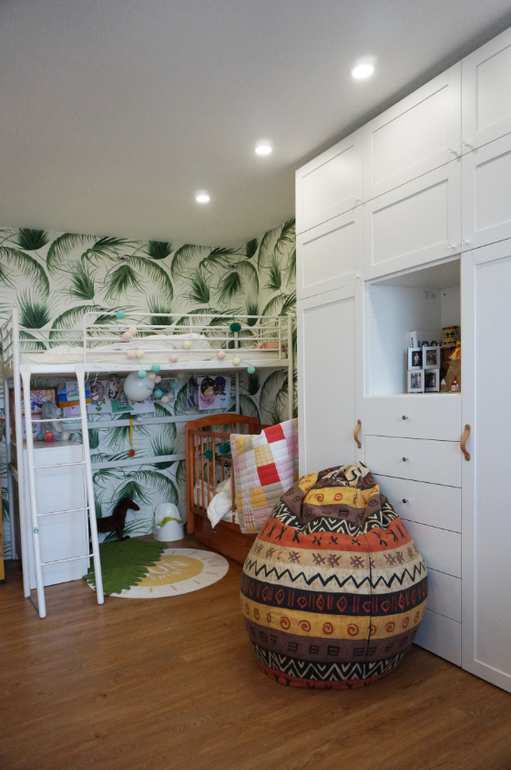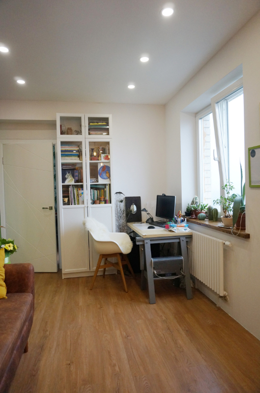 Фото сделали сразу, как заехали, кроватка детская уже замененена на икеа раздвижную. А вообще почти вся мебель икеа. На стенах обои из Леруа и с пальмами в детской не помню откуда), на полу кварцвиниловая плитка везде.
