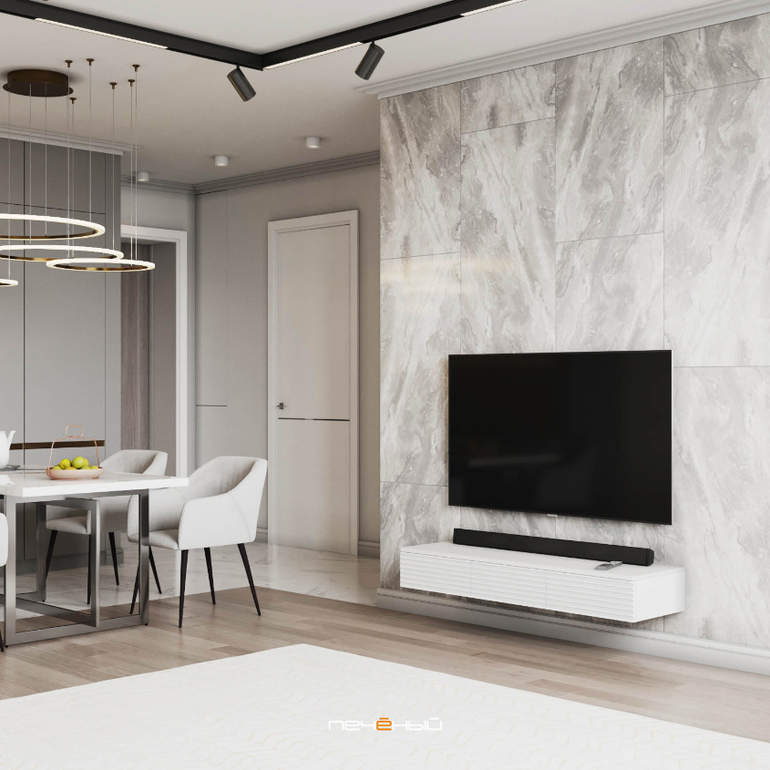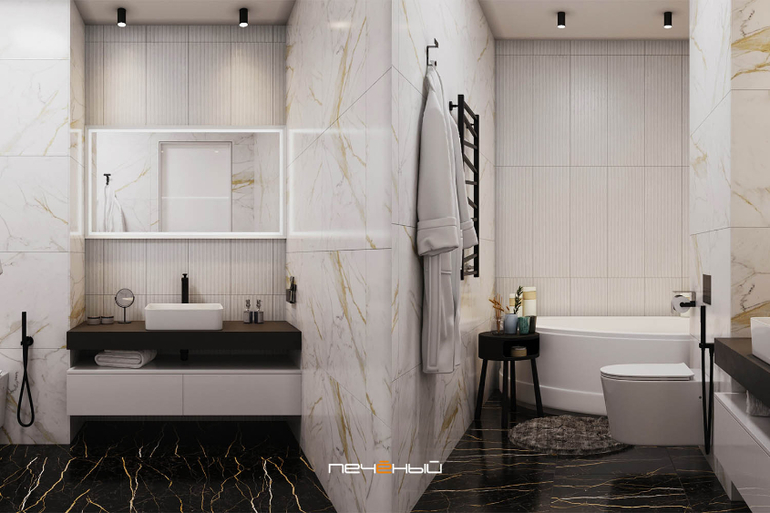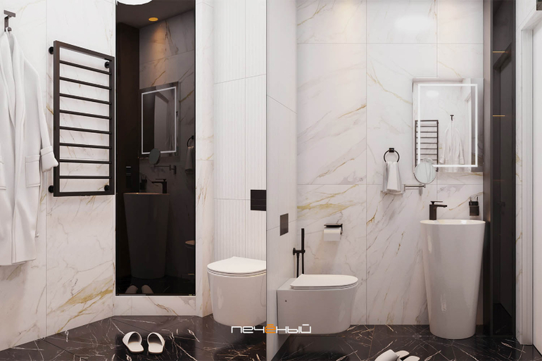 Мрамор - ещё один объединяющий элемент оформления квартиры. Он был в кухне-гостиной, мраморные мотивы на ковре встречались в большой спальне. Не забыли мы и о геометрии - это белая плитка с объёмным рельефом. Можно провести параллель с чёрной стеклянной дверцей и со шкафом в спальне.