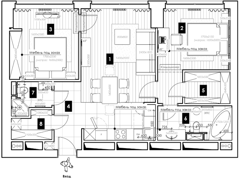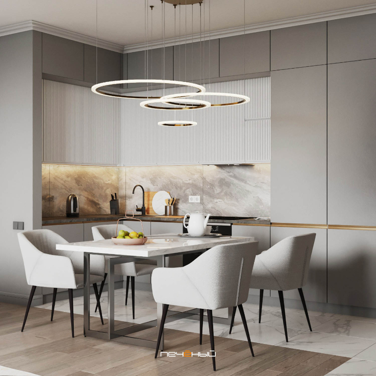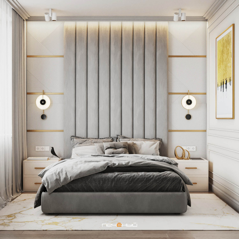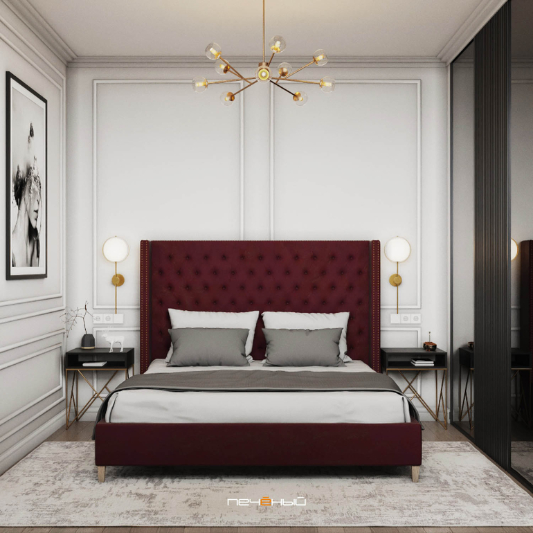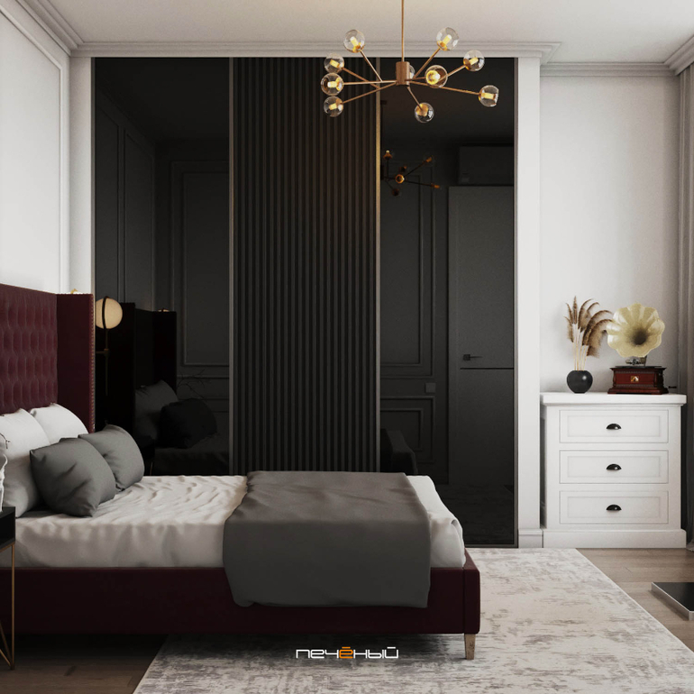 Шкаф делали на заказ. Нам нужен был такой, чтоб под самый потолок, к тому же, мы специально подбирали фасады под наш проект. Если обратили внимание, то центральная створка шкафа - объёмная панель - перекликается с кухонными фасадами, этакий объединяющий нюанс.