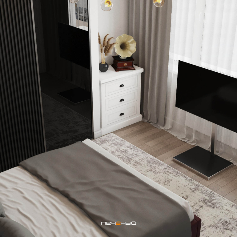 ТВ под окном - несколько нестандартный подход, но получилось оригинально. :) Так уж выходило по планировке, что или телевизор на стену, или шикарная кровать с мягким изголовьем. Но телевизор-то хотелось! Вот и решили дилемму. Чтобы в солнечный день свет не слепил глаза, окно можно прикрыть шторами-блэкаутами.