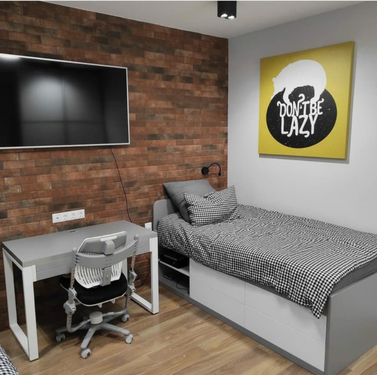 Для мальчишек 10-12 лет и старше, которые как раз входят в пубертат классная комната, добавятся личные вещи, постеры, носки под кроватями и рубашки на стульях и будет классная уютная комната) Помню себя в таком возрасте примерно мне уже хотелось более строгую и «крутую комнату»)))