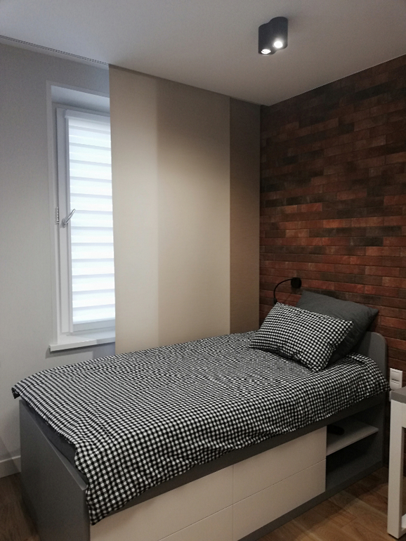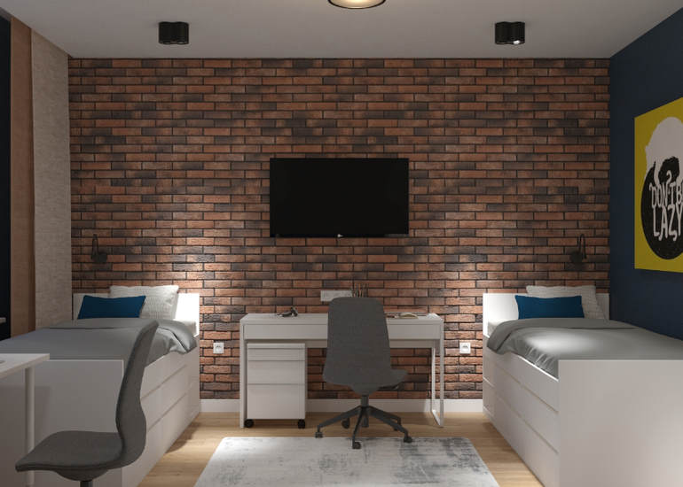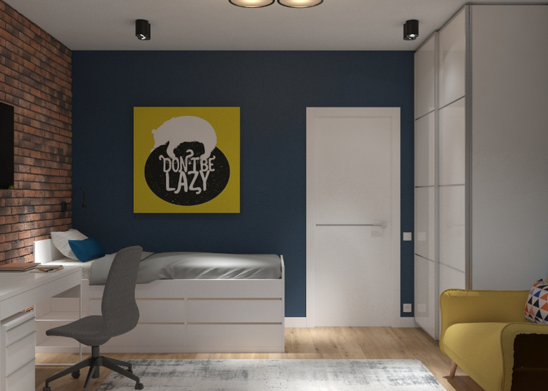 Цветовая гамма с модным кирпичом тут, по-моему, больше подходит для кафе, чем для детской. Спортивного уголка нет, зато впихнули диван с подушками - это точно комната для пацанов, а не почтенных пожилых людей, любящих чинно сидеть и не вертеться?