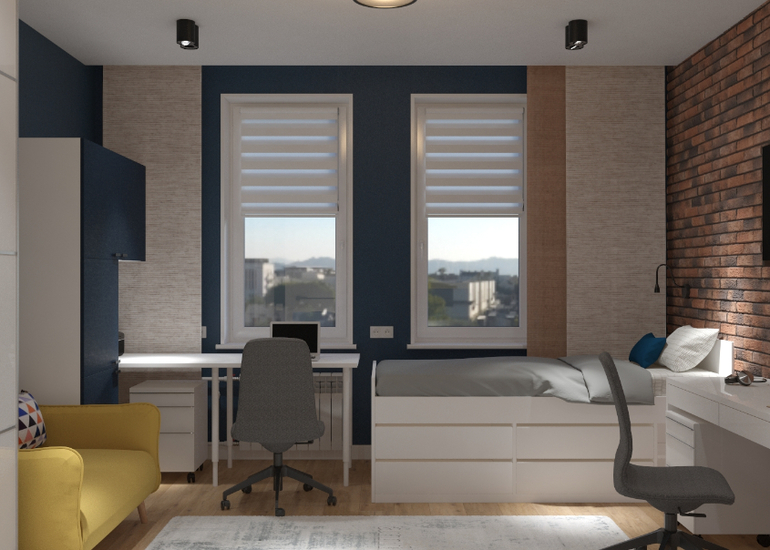 Отвратительный проект ! Всегда считала что дизайнера нанимают для совместить функционал и красоту. Здесь , все мимо🤦♀️ И без того темная комната стала ещё темнее благодаря темным стенам , ещё и маленькое окно закрыли фальш -стеной 🙈 один из детей сидит с видом на стену?! Это как? Что мешало поставить рабочие поверхности к окну, а кровать убрать от окна?