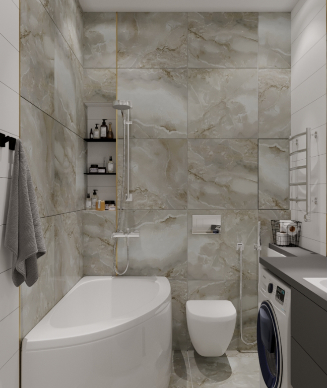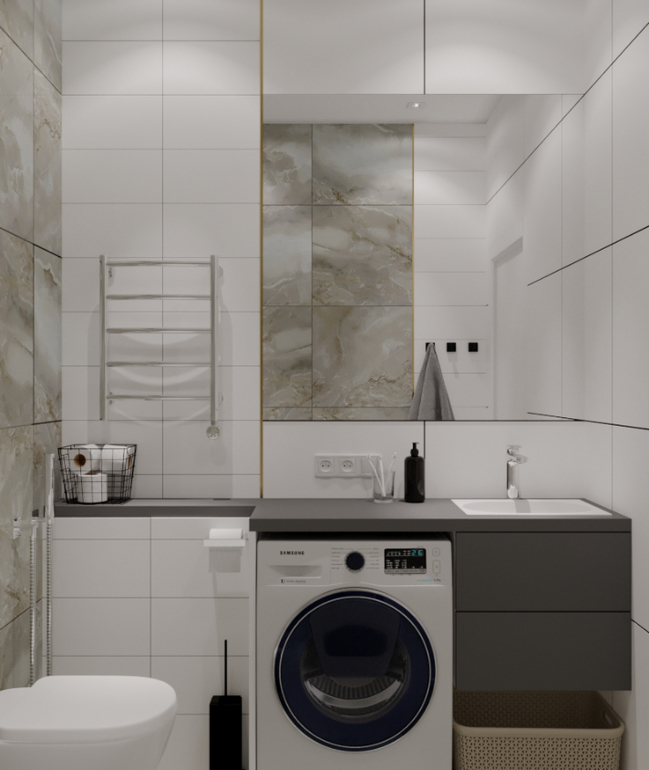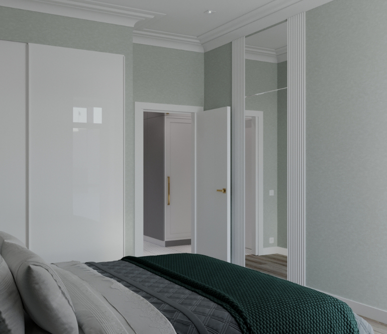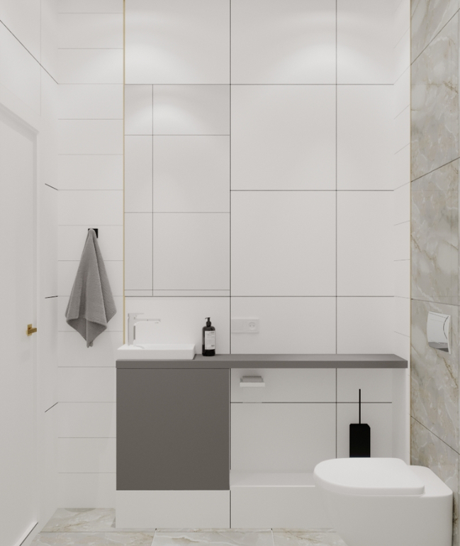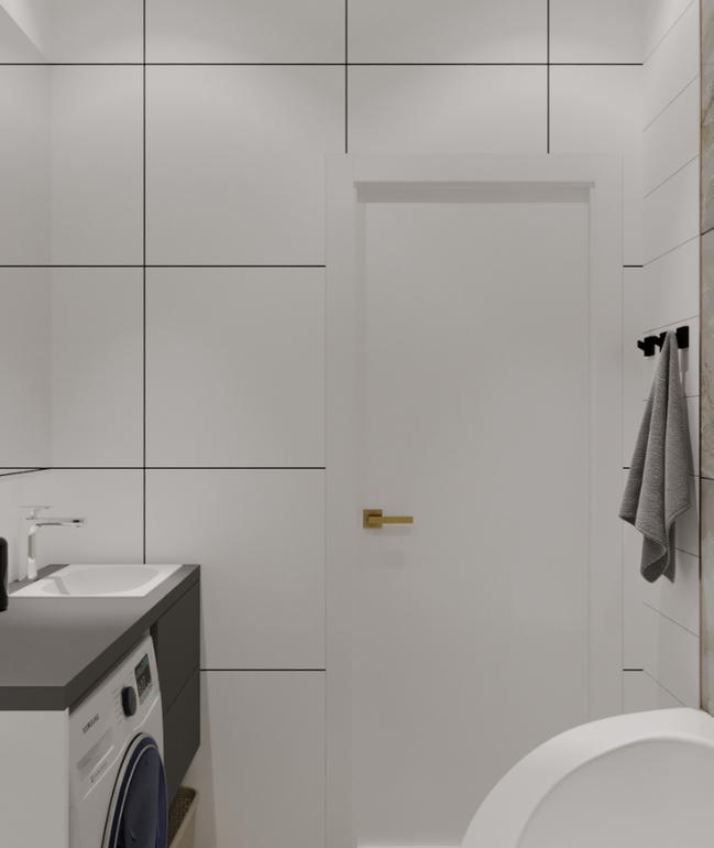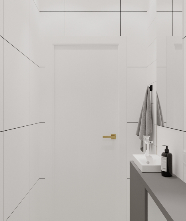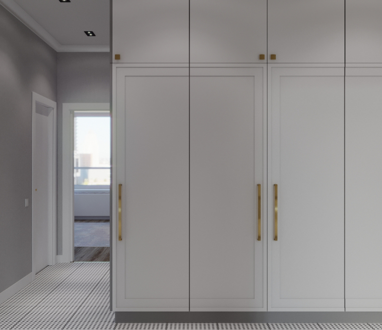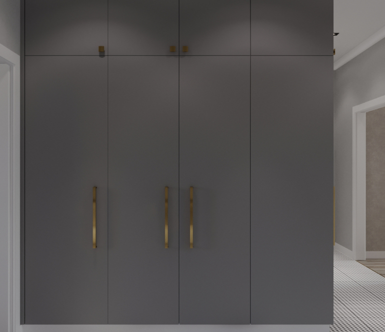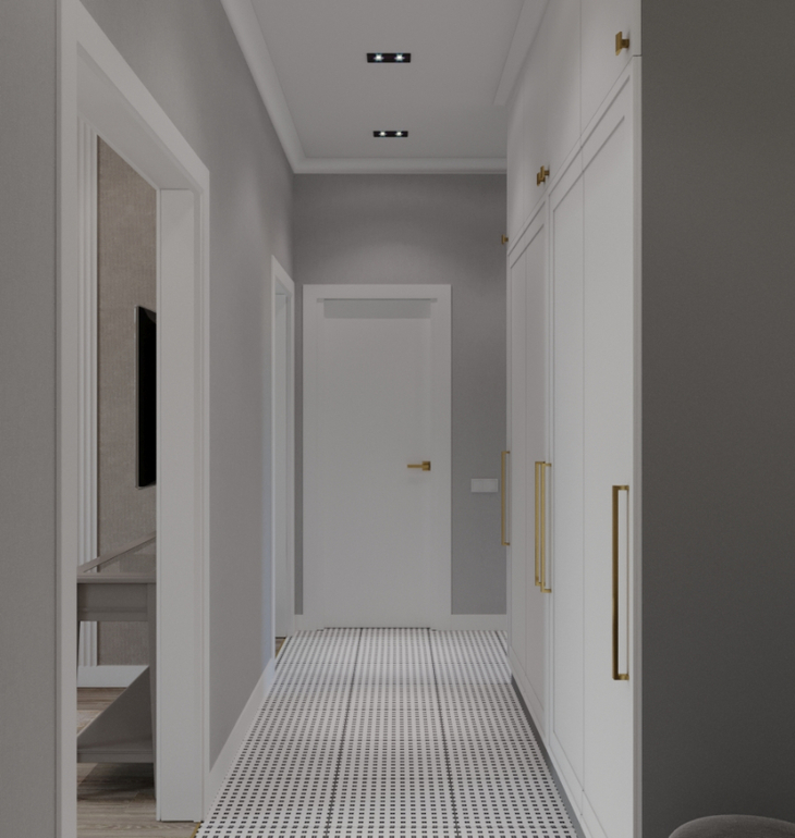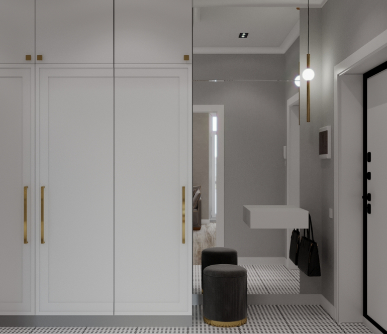 Мы не стали делать перепланировку квартиры. Тут будут установлены только стенки для встроенных шкафов и сместили дверь в ванной для необходимой нам расстановки. Мебель будет на заказ. Давайте начнем с коридора) По длинной стене будет высокий шкаф. При входе небольшая полка-ящик для мелочей, пуф. Обувницу решили не ставить,вся обувь будет убираться сразу в шкаф. Шкаф с белыми фасадами плавно переходит в неглубокий шкаф с серыми фасадами. Тут будет хранение хоз.принадлежностей, ведра, пылесоса, корзин с грязным бельем.