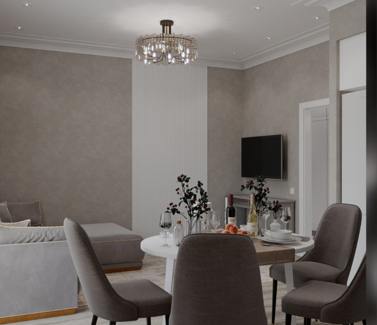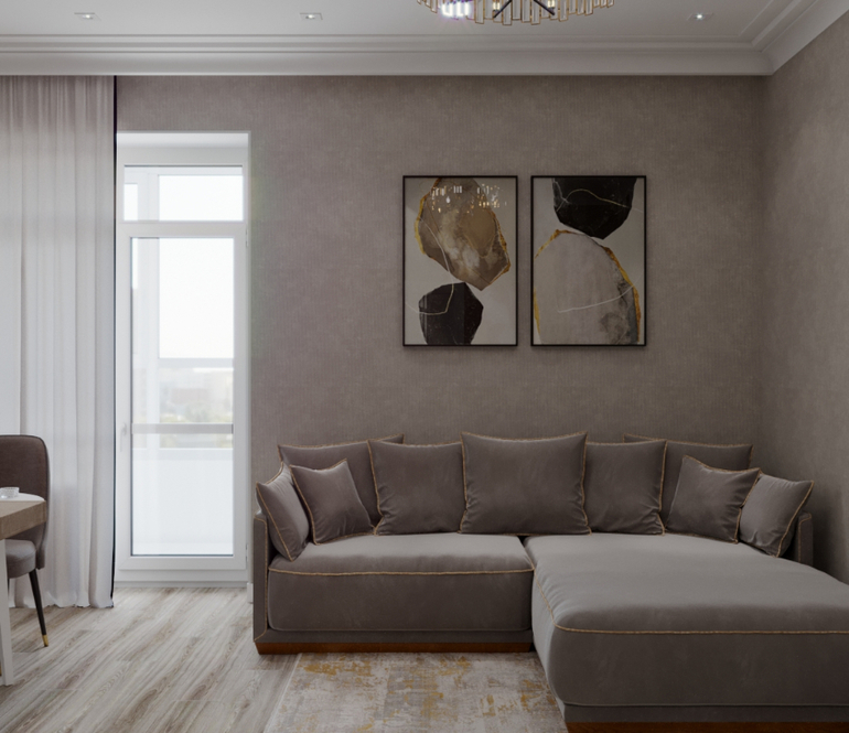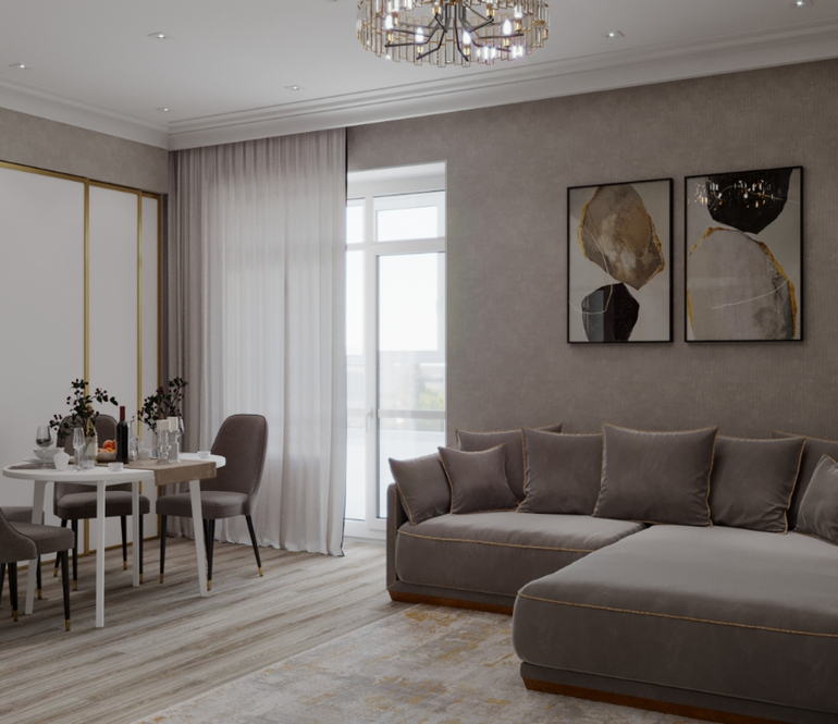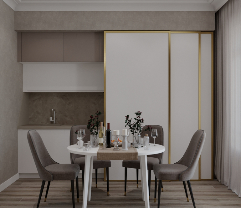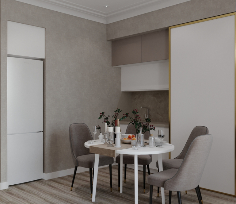 В квартире кухня совмещена с гостиной. Хозяйке очень нужно было максимально скрыть кухню. Перегородку тут делать смысла не было, всего одно небольшое окно. Современные системы скрытых кухонь сейчас не везде продают, да и стоят они дорого. Было решено поставить раздвижные двери купе. Есть в этом и "минус". Часть кухни будет не доступна...ближние шкафы у окна. Но мойка,варочная с духовкой и холодильник в полном доступе.Необходимое нужно достать заранее из шкафа и тогда можно смело готовить) На это решение хозяйка согласна.
