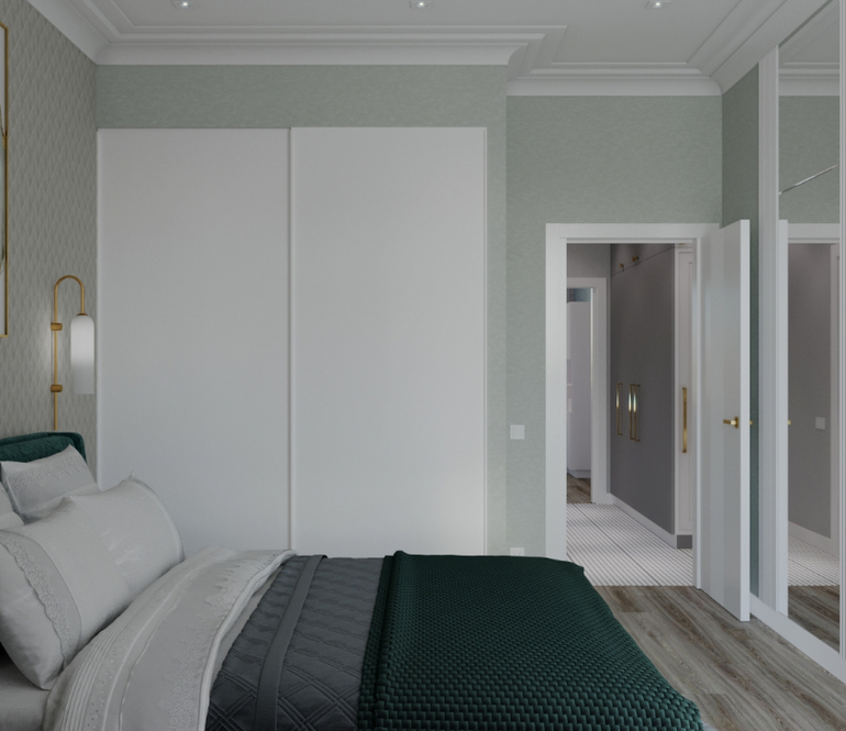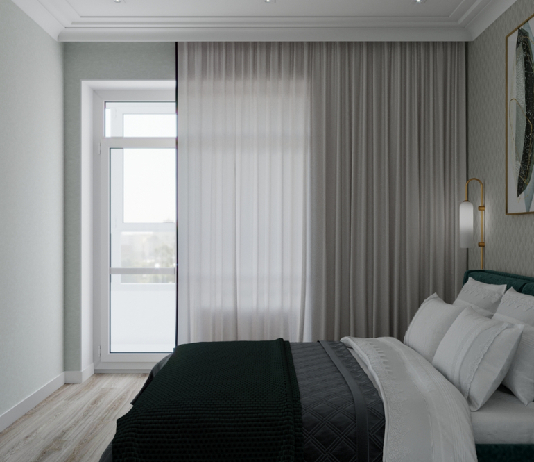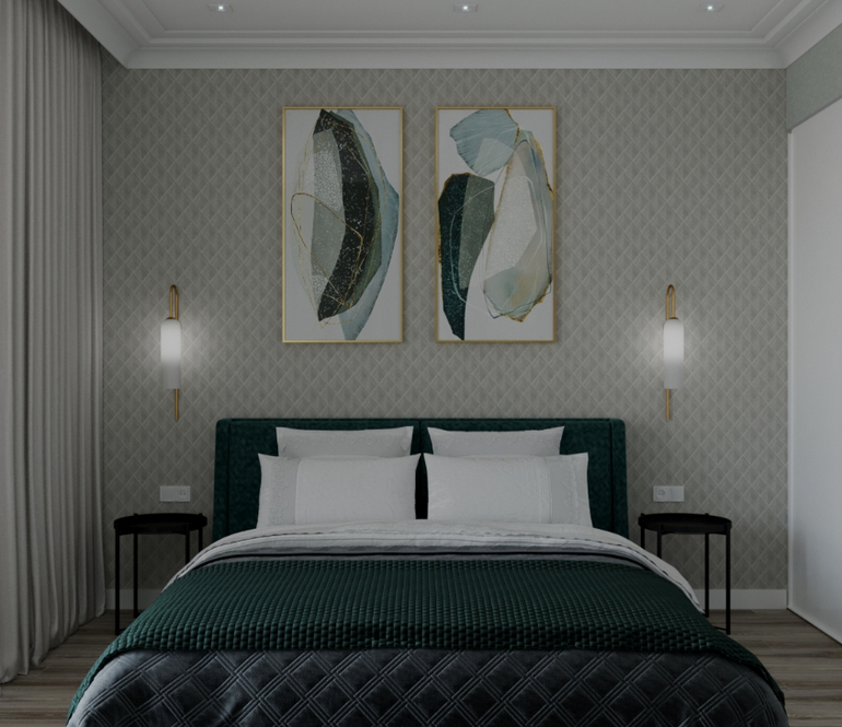 В спальне самое необходимое-кровать,шкаф и тумбочки)