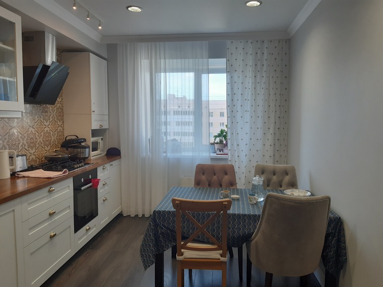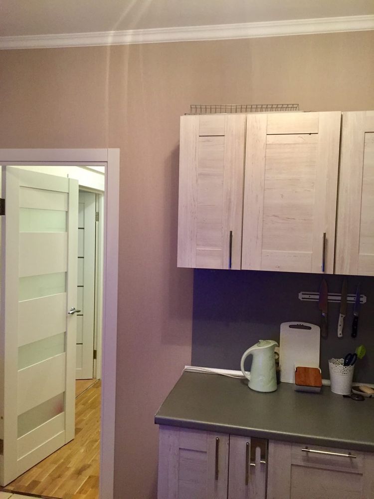 Кухня однотонная, бежевая, но с приятной текстурой обоев. Столешница осталась от предыдущего владельца, я заменила фасады на шкафах.