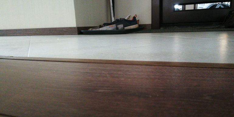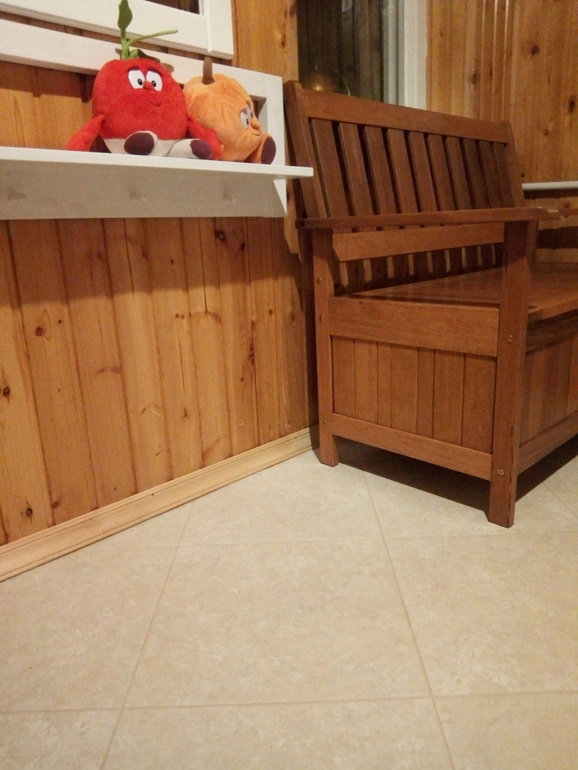 Здравствуйте, мы на даче только что меняли пол. Светлый керамогранит и деревянный плинтус. Крепили на саморезы.