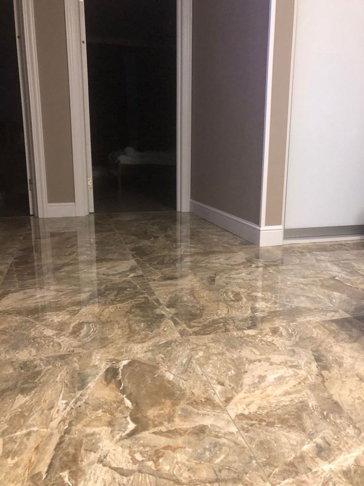 Во всем доме керамогранит(теплый пол) и плинтус сделали сами:нарезали полоски высотой 6 см. Смотриться красиво, аккуратно и неубиваем..